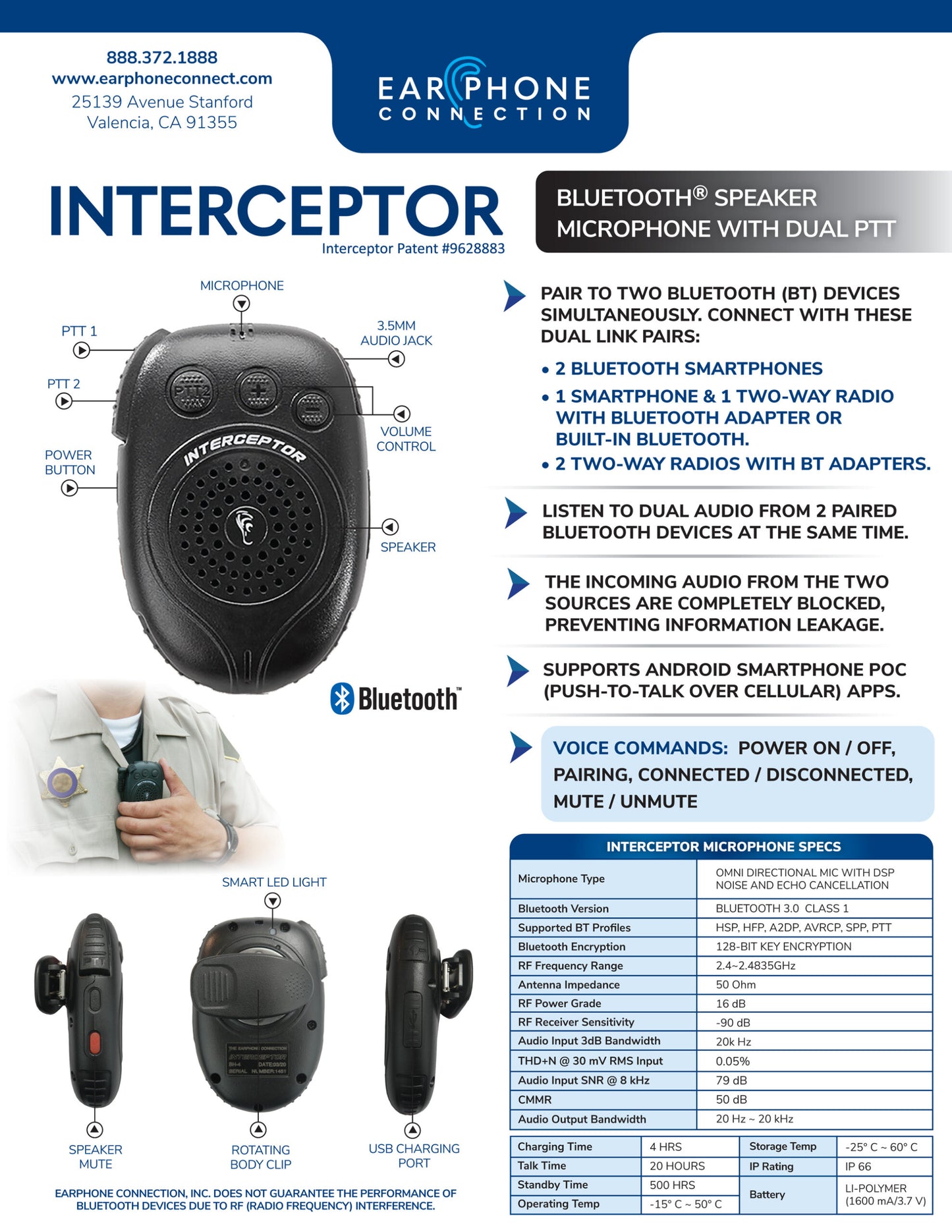 - Uni-directional mic, 128-bit encryption, 20 hr talk time.